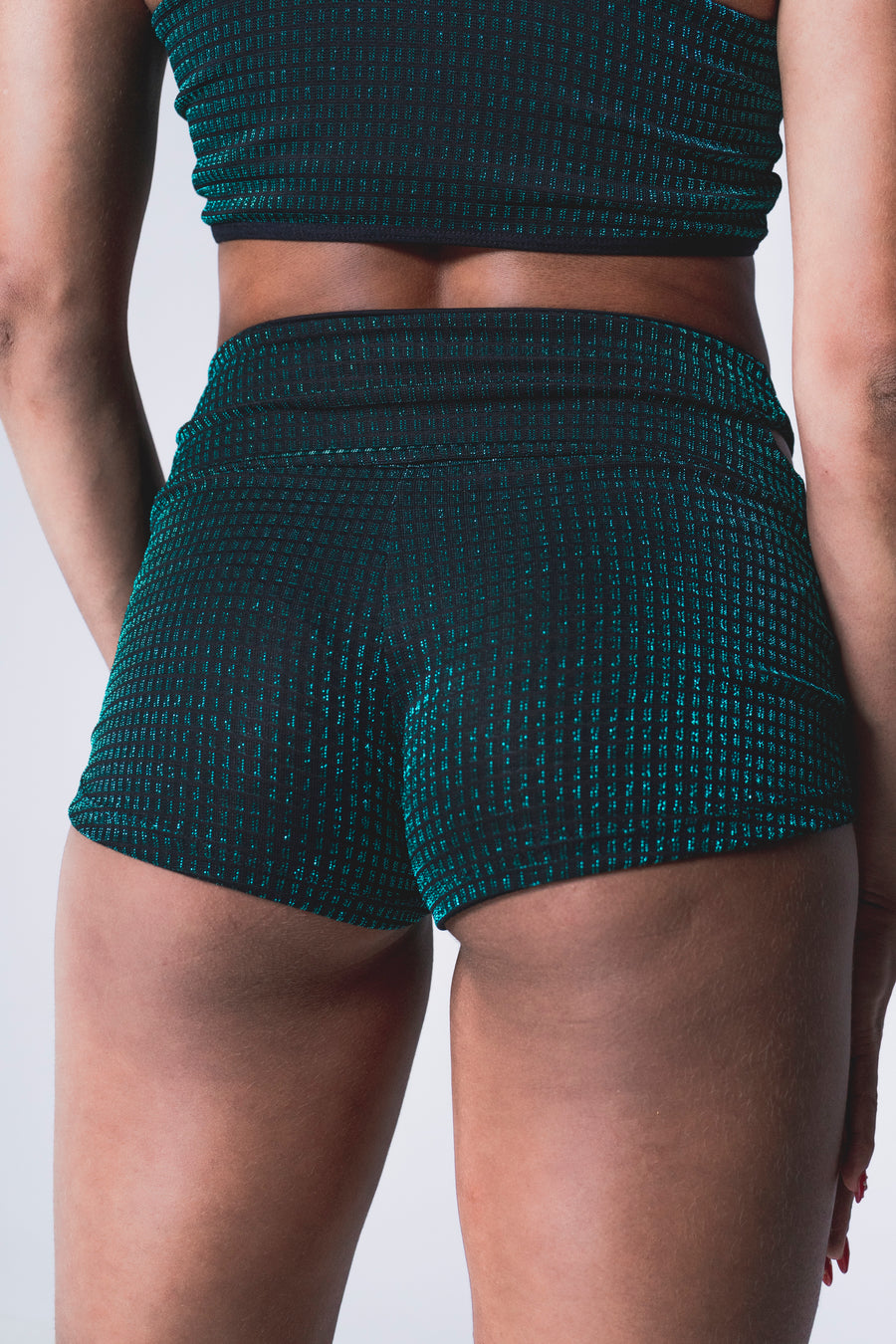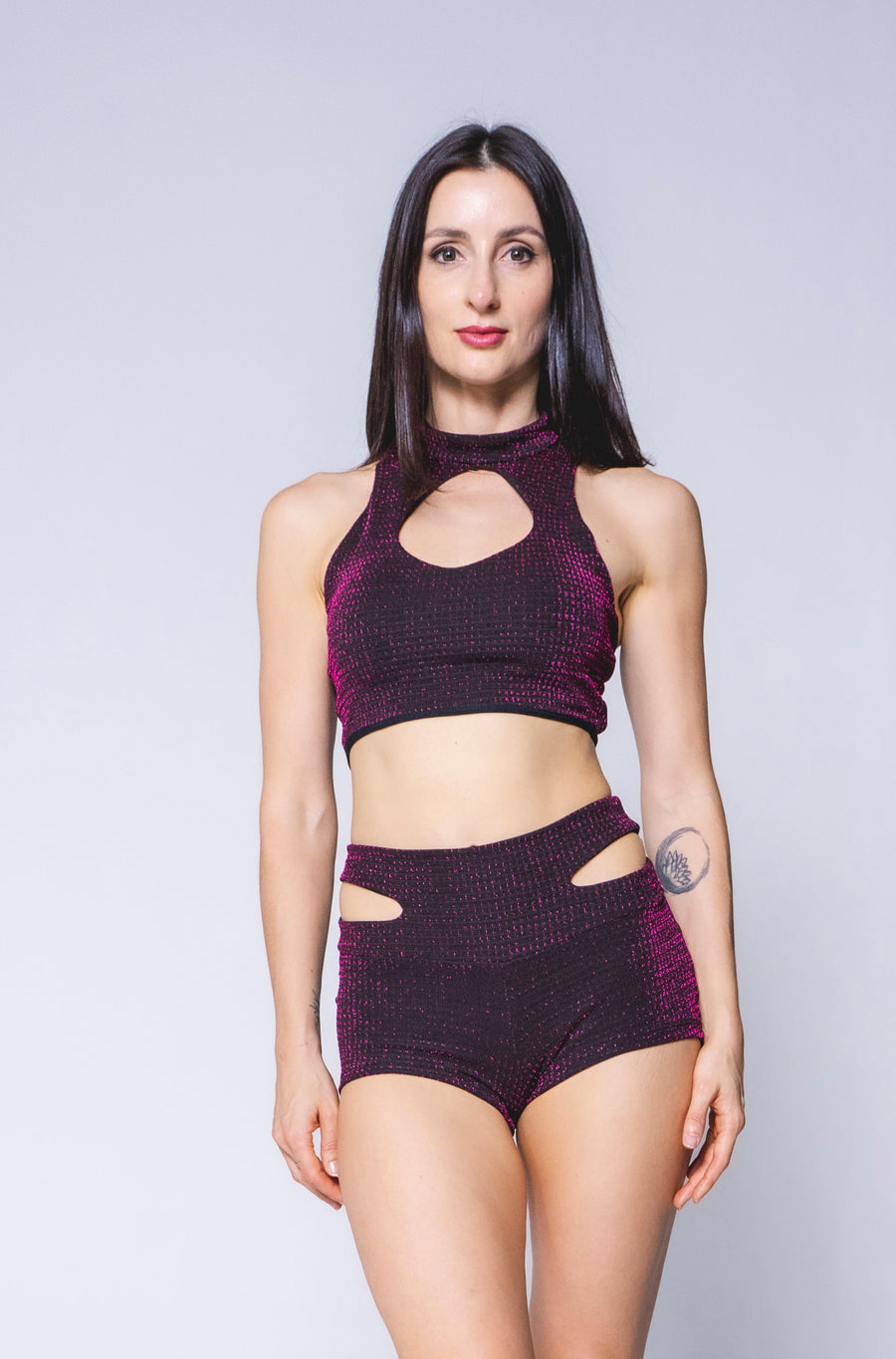 Stay stylish and supported with these sporty full-coverage shorts, designed for movement and made from shiny lurex fabric. Featuring cute cut-out details along the sides, they effortlessly highlight your waist while maintaining a modest yet flattering silhouette.